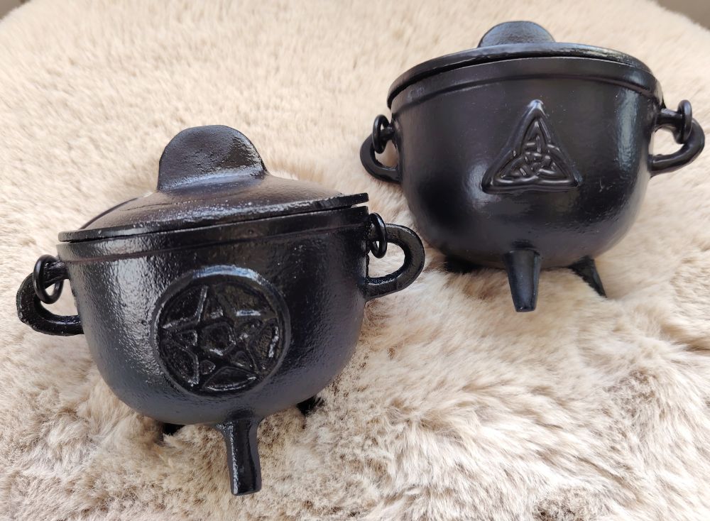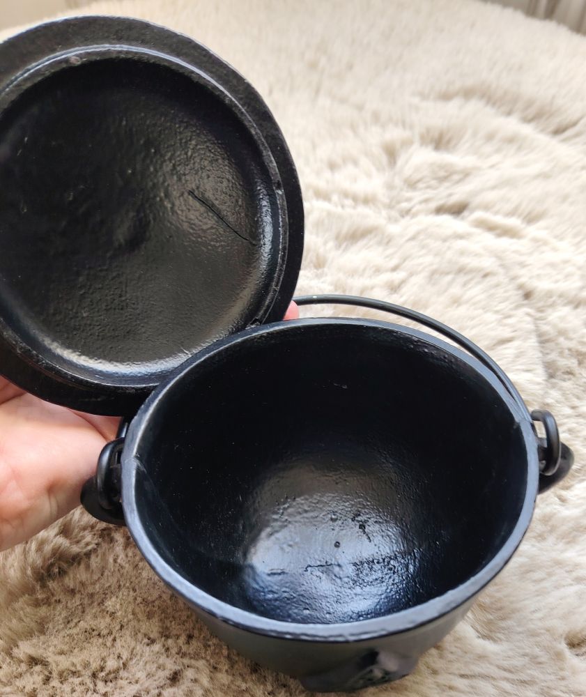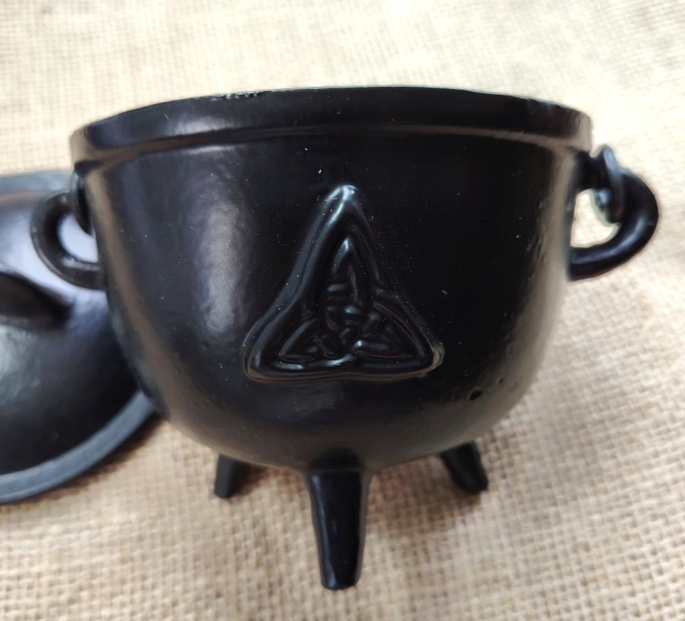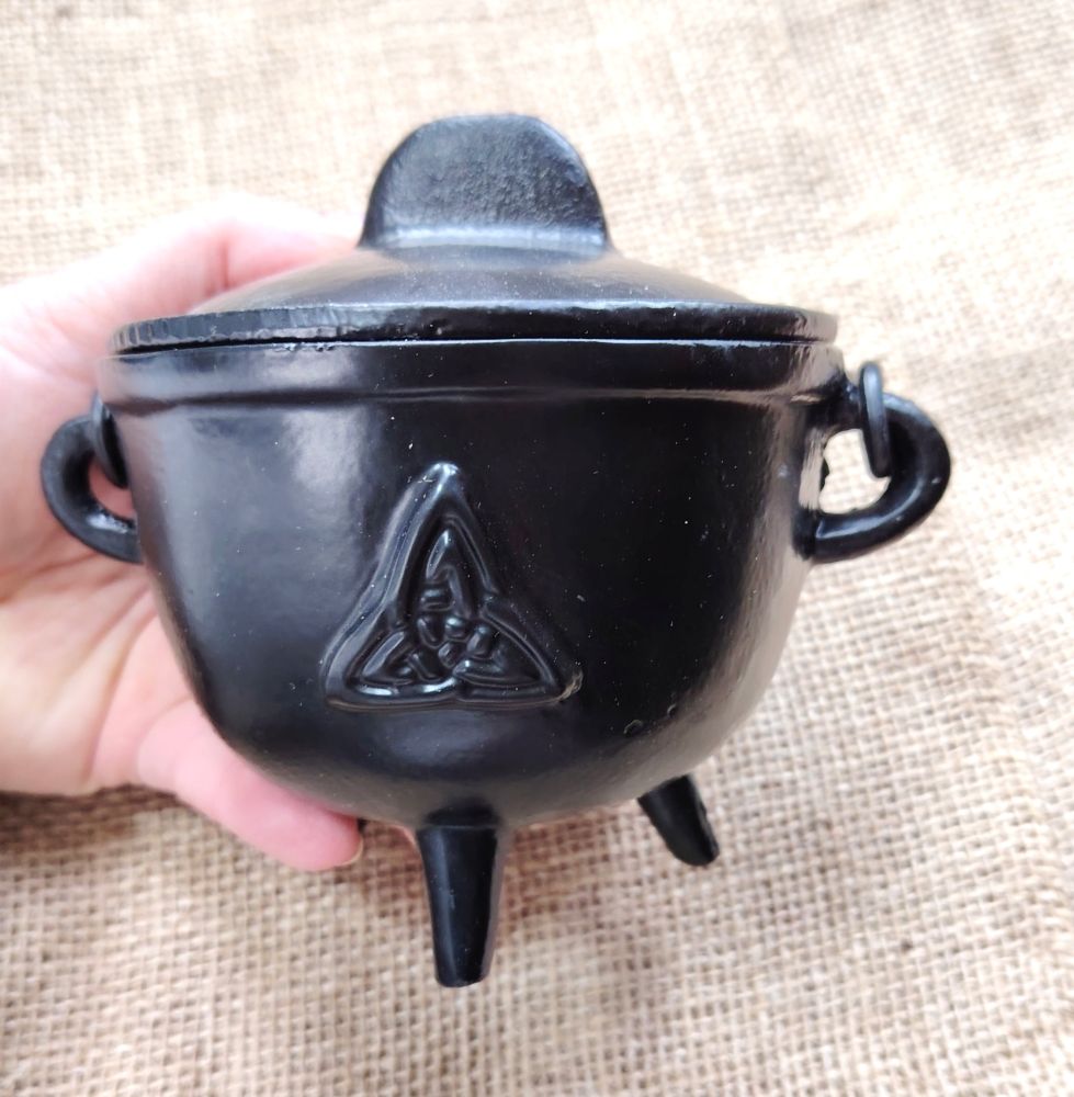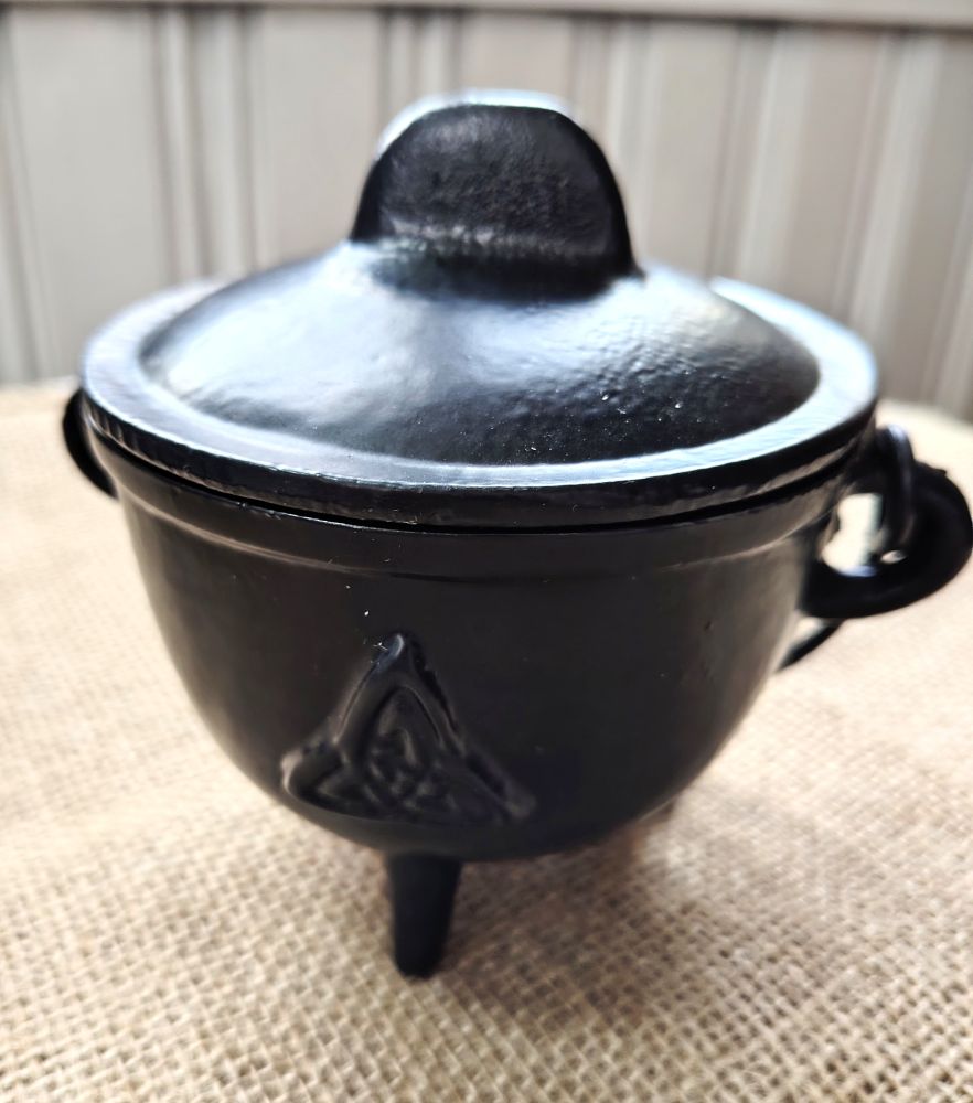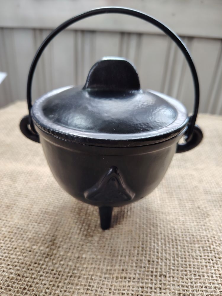 Valurautapata rituaaleihin tai suitsukkeiden polttamiseen. Täytä hienolla hiekalla ja aseta suitsukehiili sen päälle ja siihen irtosuitsukkeet. Tai polta valmiita suitsuketikkuja. Käytännöllinen myös muihin omien juttujen tekemiseen padassa. Kolmijalkainen pata on vakaa.