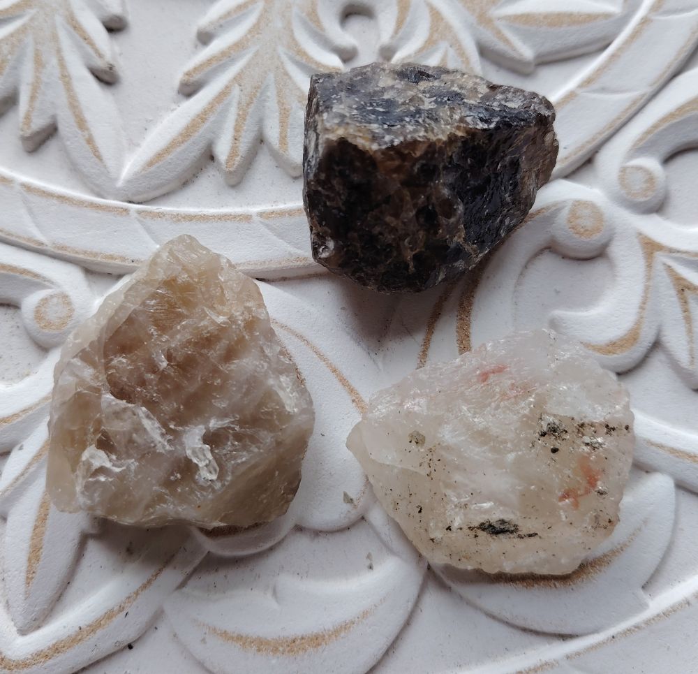 Tässä setissä on kolme Shamaanittaren valitsemaa Pohjolan kvartsia, jotka ovat peräisin Kuortaneelta, Etelä-Pohjanmaalta. Setissä on vuorikvartsi, vaalea savukvartsi ja tumma savukvartsi. Setin yhteispaino on 123g. Vuorikvartsin mitat 3,5 cm x 4,5 cm (kivi on litteä), vaaleamman savukvartsin mitat 4 cm x 4,5 cm ja tummemman savukvartsin mitat 3 x 4 cm (tämä kivi on näistä paksuin). Uniikki setti eli saat kuvassa näkyvät kivet itsellesi.