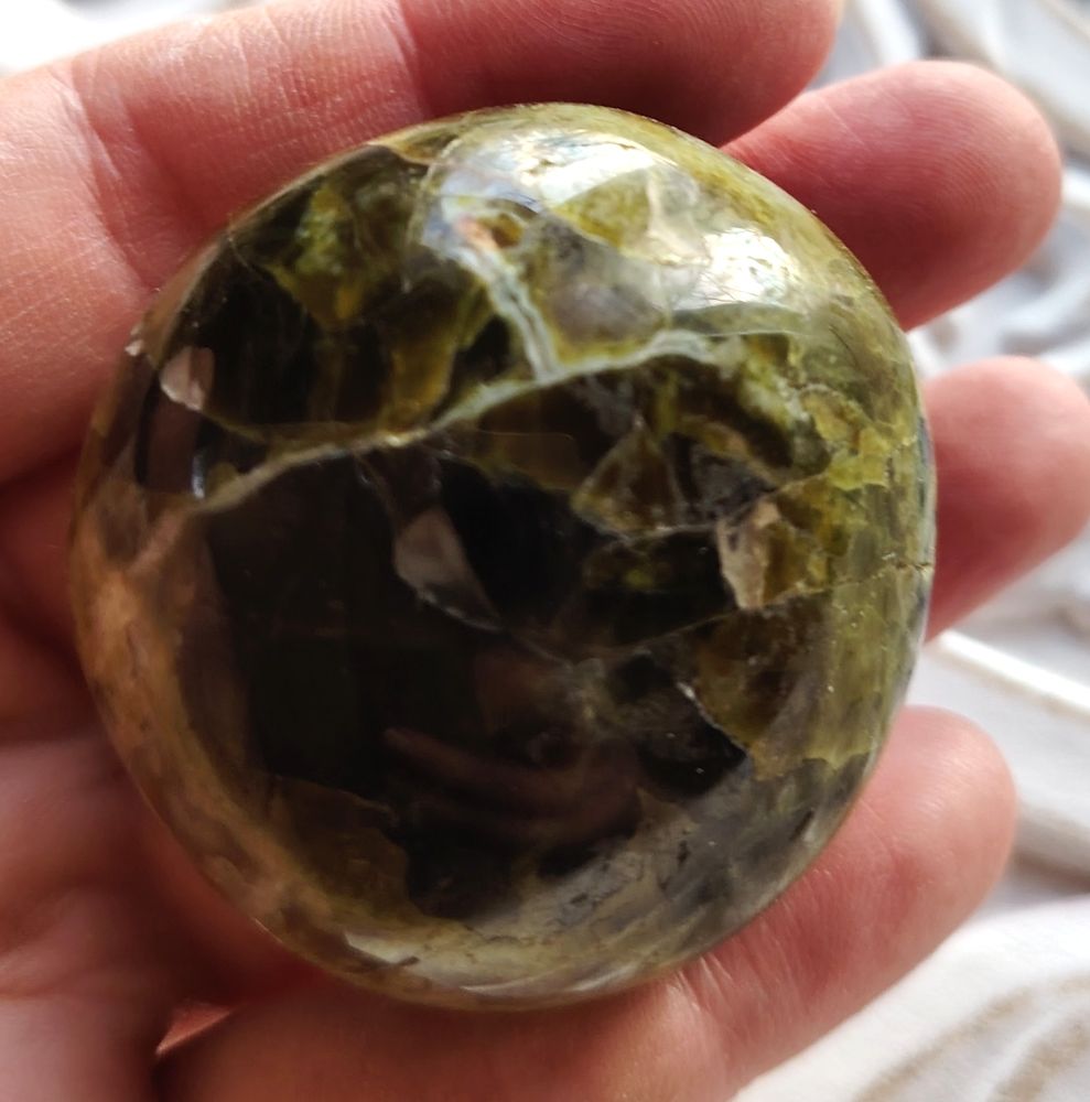 Pullea kämmenkivi, joka on pyöreähkö. Saat itsellesi kuvassa näkyvän kiven. Kiven koko: 4,5 cm x 4,5 cm, paino 84 g.