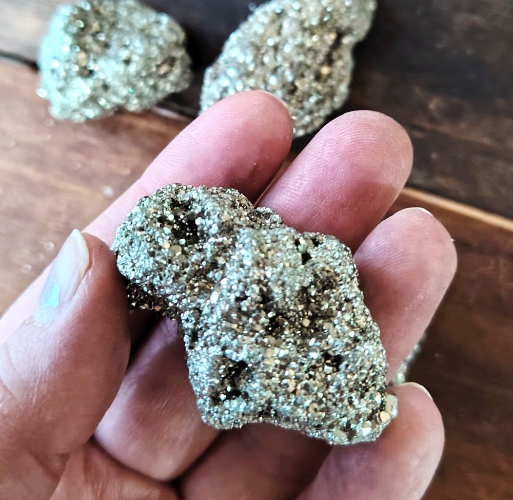 Shamaanittaren kivi-info: Pyriitti on vahva kivi edistämään positiivista ajattelua ja manifestointia. Se tunnetaan myös nimellä "Fool's Gold" koska se näyttää kimpaleelta kultaa. Uusimmat tutkimukset ovat löytäneet joistakin pyriiteistä myös aitoja kultahippusia. Kivi on saanut nimensä kreikankielisestä sanasta "pyro" joka tarkoittaa tulta. Nimi valittiin kivelle siksi, koska jos lyöt kahta kiveä yhteen, niin niistä tulee kipinöitä. Amerikan alkuperäisväestö käytti pyriittiä meditaatiossa ja työkaluna seremonioissa. Pyriitti omasi parantavia voimia ja sen ajateltiin pitävän todellista taikuutta sisällään. Pyriittiä on arvostettu myös sen kyvystä suojella eli se muodostaa kilven kantajansa ympärille kaikelta negatiiviselta energialta sekä myös ympäristön saasteilta.