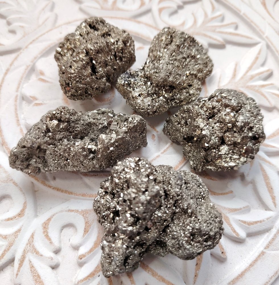 Shamaanittaren kivi-info: Pyriitti on vahva kivi edistämään positiivista ajattelua ja manifestointia. Se tunnetaan myös nimellä "Fool's Gold" koska se näyttää kimpaleelta kultaa. Uusimmat tutkimukset ovat löytäneet joistakin pyriiteistä myös aitoja kultahippusia. Kivi on saanut nimensä kreikankielisestä sanasta "pyro" joka tarkoittaa tulta. Nimi valittiin kivelle siksi, koska jos lyöt kahta kiveä yhteen, niin niistä tulee kipinöitä. Amerikan alkuperäisväestö käytti pyriittiä meditaatiossa ja työkaluna seremonioissa. Pyriitti omasi parantavia voimia ja sen ajateltiin pitävän todellista taikuutta sisällään. Pyriittiä on arvostettu myös sen kyvystä suojella eli se muodostaa kilven kantajansa ympärille kaikelta negatiiviselta energialta sekä myös ympäristön saasteilta. Pyriitin energiat resonoivat suoraan solar plexus chakran kanssa, joka aktivoi henkilökohtaista voimaa. Työskentele pyriitin kanssa, jos tahdot saavuttaa tavoitteet elämässä. Meditoi kiven kanssa ja anna sen auttaa sinua manifestoimaan toivomiasi asioita. Asiat kannattaa sanoa ääneen tai kirjoittaa paperille.