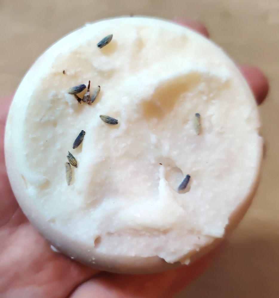 Tässä saippuassa on merisuolaa, violettia kaoliinia sekä laventelin eteeristä öljyä.