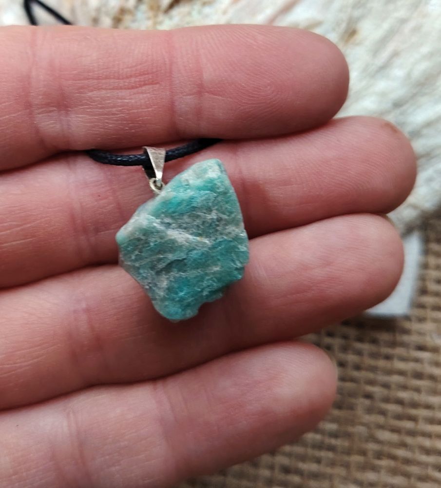 Raakapala amatsoniittia, joka on tehty koruksi. Mukaan saat vahattua mustaa nyörinauhaa, joka on solmittava ja sen pituus on n. 80 cm. Fiksaa nyöriä lyhyemmäksi tai vaihda koruun esim. hopeaketju. Jokainen kivi koruissa on hieman eri muotoinen luonnollisten ominaisuuksien vuoksi. Ostaessasi korun, saat kuvassa näkyvän yksilön. Koko on n. 1,5 cm x 1,5 cm. PS: tämä kivikoru on kooltaan pieni.