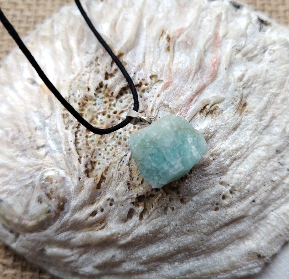 Raakapala amatsoniittia, joka on tehty koruksi. Mukaan saat vahattua mustaa nyörinauhaa, joka on solmittava ja sen pituus on n. 80 cm. Fiksaa nyöriä lyhyemmäksi tai vaihda koruun esim. hopeaketju. Jokainen kivi koruissa on hieman eri muotoinen luonnollisten ominaisuuksien vuoksi. Ostaessasi korun, saat kuvassa näkyvän yksilön. Koko on n. 1 cm x 1 cm. PS: tämä kivikoru on kooltaan pieni.