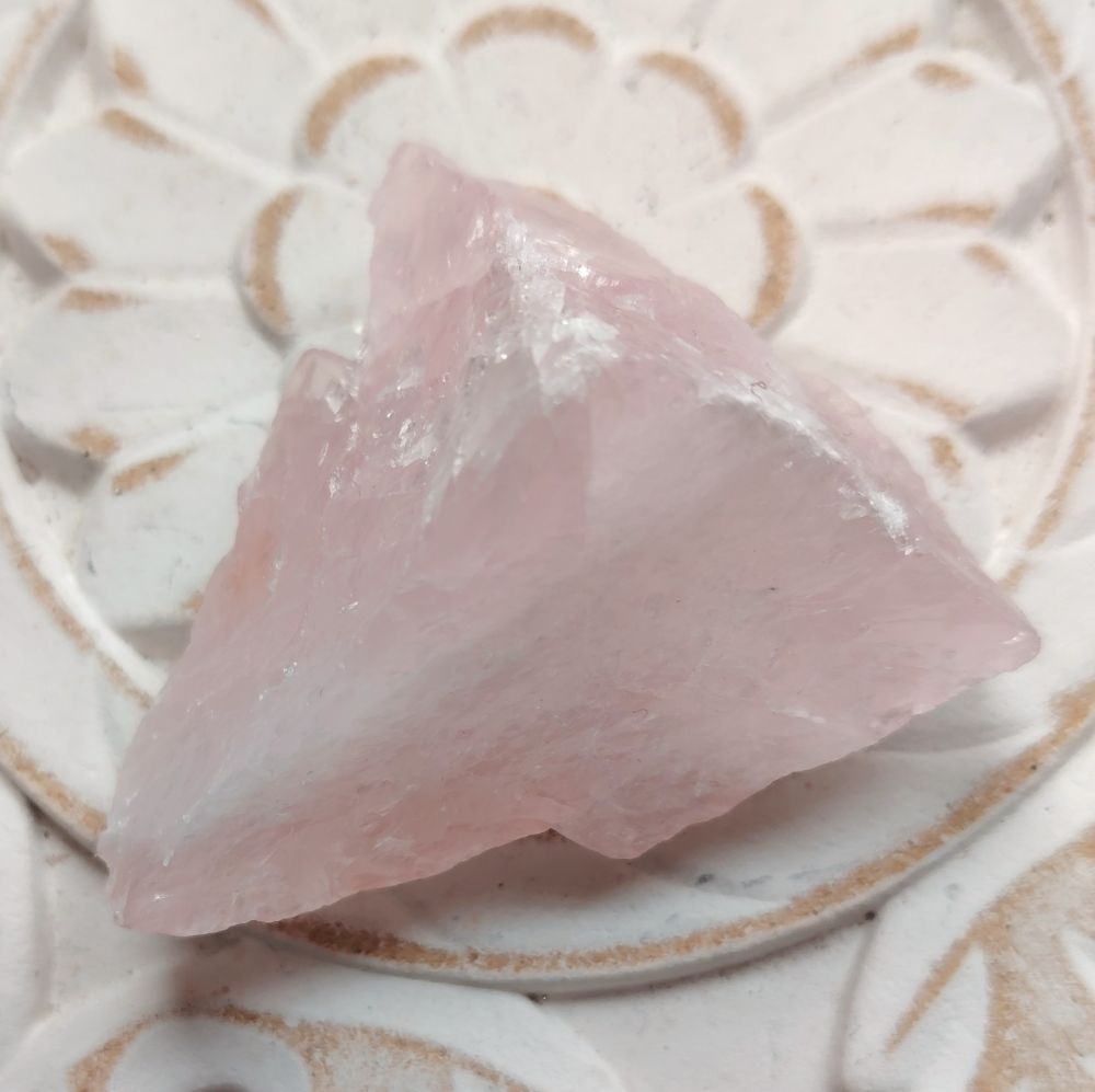 Ruusukvartsia Brasiliasta. Saat itsellesi kuvassa näkyvän kiven. Paino 78 g, koko 5,5 x 6 cm, paksuus n. 2-4 cm. Tämä on hieman erikoisen mallinen kivi, kolmion mallinen.