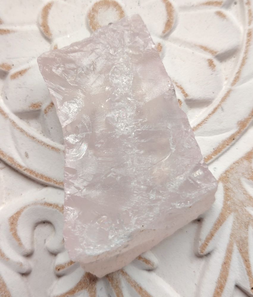 Ruusukvartsia Brasiliasta. Saat itsellesi kuvassa näkyvän kiven. Paino 69 g, koko 4,5 x 6,5 cm, paksuus n. 1-2 cm. Tämä on kauniisti läpikuultava ruusukvartsi ja erikoinen hieman suorakaiteen muotoinen.