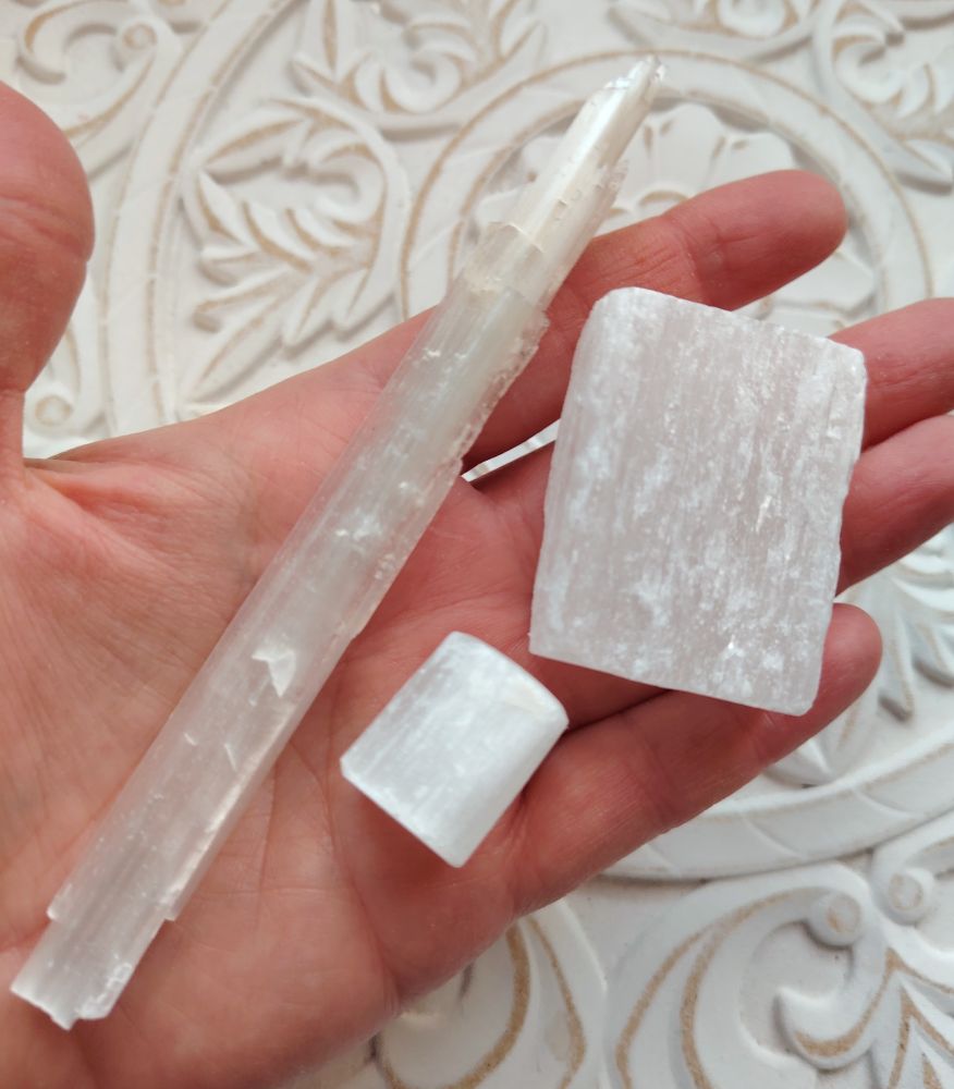 Seleniittisetti, jossa on raakapala sauva + laatta ja hiottu kivi. Saat kuvassa näkyvät kivet itsellesi!