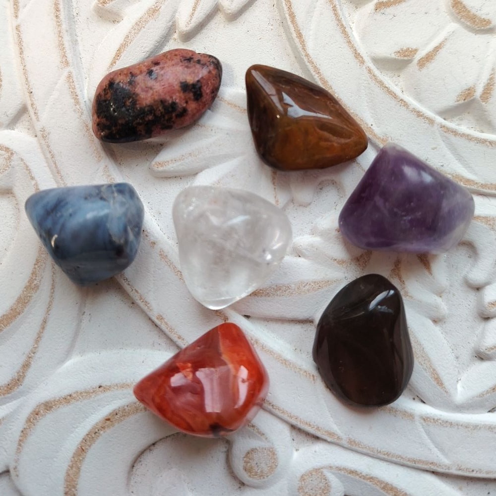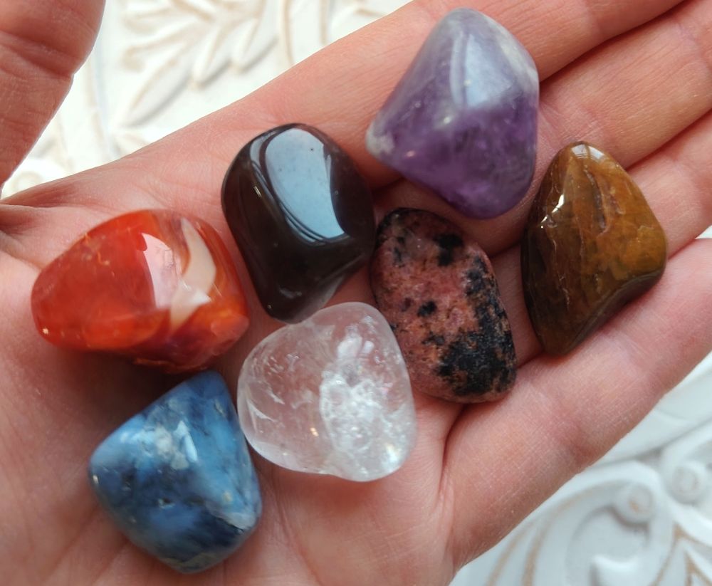 Tässä setissä on seitsemän erilaista Shamaanittaren valitsemaa kristallia seitsemälle päächakralle. Kivet ovat sileitä, joten ne on helppo asetella chakrojen päälle tai ottaa kämmeniin, kun tahdot hoitaa itseäsi. Kivien koko ja muoto hieman vaihtelee luonnollisten ominaisuuksien vuoksi, mutta yhden kiven koko on n. 2 cm x 3 cm.