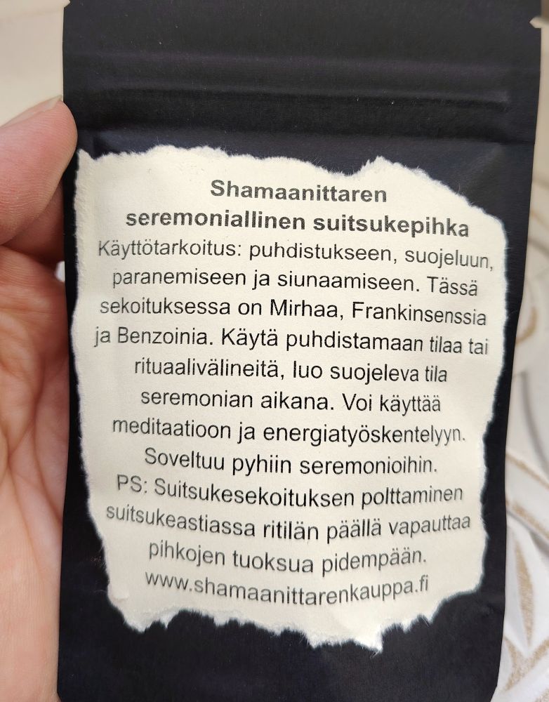 Käyttötarkoitus: puhdistukseen, suojeluun, paranemiseen ja siunaamiseen. Tässä sekoituksessa on Mirhaa, Frankinsenssia ja Benzoinia. Käytä puhdistamaan tilaa tai rituaalivälineitä, luo suojeleva tila seremonian aikana. Voi käyttää meditaatioon ja energiatyöskentelyyn. Soveltuu pyhiin seremonioihin. Pussissa on 30 g suitsukepihkaa.