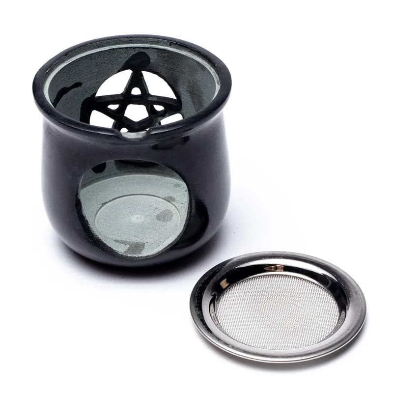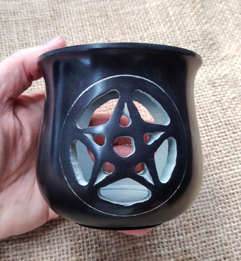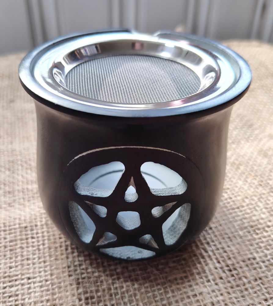 Tämä suitsukeastia on tehty vuolukivestä ja koristeena on pentagram. Irrallinen siivilä, jonka päälle voit asettaa irtosuitsukkeita ja lämpökynttilä alle palamaan. Kynttilän lämmön vaikutuksesta ritilän päälle asetettu irtosuitsuke alkaa levittää ihanaa tuoksua ympärilleen. Savuttaa vähemmän kuin jos poltat irtosuitsukkeita hiilen päällä sekä pihkojen tuoksut tulevat myös paremmin esiin.