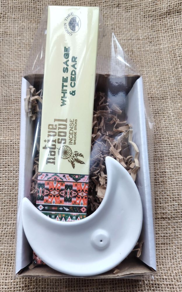 Tässä setissä on valkoisesta keramiikasta valmistettu suitsuketeline, joka on puolikuun mallinen. Mukana paketti eettisesti valmistettuja Native Soul brandin valkosalvia + cedar suitsukkeita.