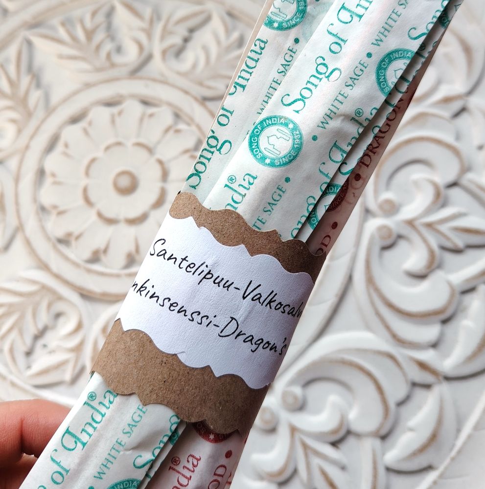 Nämä käsin pyöritetyt masala suitsukkeet valmistetaan huolellisesti luonnollisista puujauheista ja yrttiperäisistä öljyuutteista, jotta tuoksukokemus olisi mahdollisimman upea. Lisätietoja: käsintehtyjä, ympäristöystävällisiä, 96% aineista on luomua (ei ole sertifioitu merkkiä), ei sisällä myrkyllisiä aineita eikä eläinperäisiä aineita. Valmistuksessa ei ole käytetty lapsityövoimaa. Valmistusmaa Intia, valmistaja Song of India).