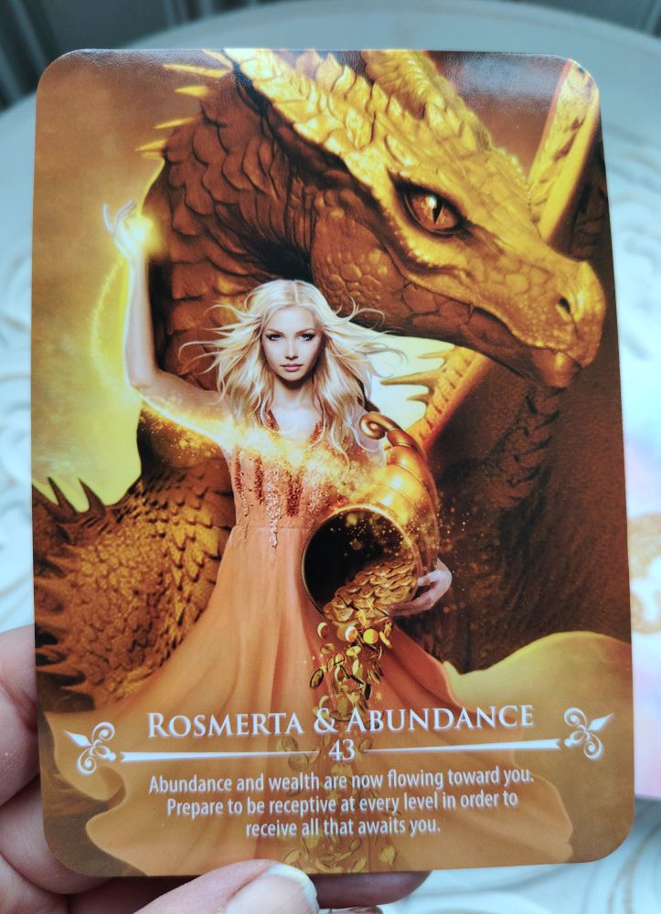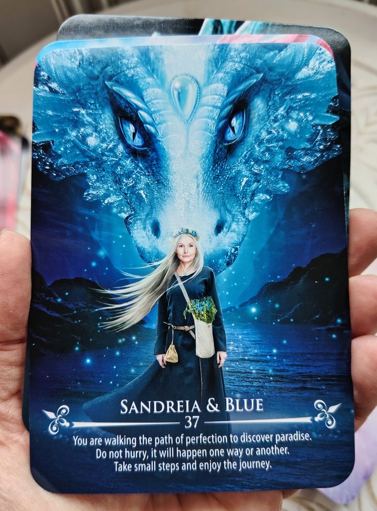 "Dragons, the oldest creatures in our universe, have accompanied gods, goddesses, planets, angels, elves, and ascended masters through the ages. Together these pairings of dragon and dragon rider create powerful energetic fields that can support us on our way to higher levels of consciousness. You will connect with dragon riders from all times, countries, and cultures, such as Kuan Yin, Archangel Michael, Mother Mary, planet god Mars, the Celtic goddess Ceridwen, and Mother Earth, along with their ancient dragon companions. The deck also includes two joker cards, featuring cats, which, like dragons, magically connect our world to the spirit world. The jokers indicate a great opportunity at hand and, instead of a message, they offer a ritual to support you in making the leap to the next level".