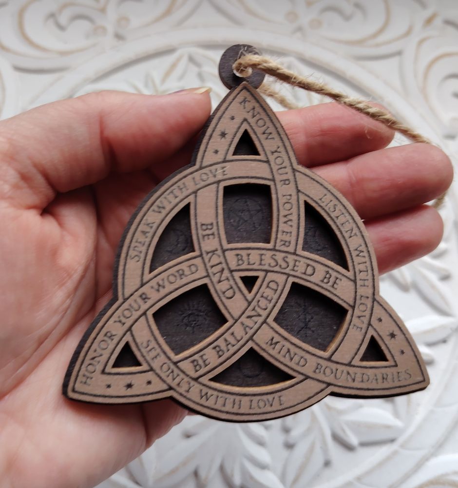 Puuvanerista tehty Yule-koriste, jossa on triquetra symboli ja kohottavat tekstit. Koko .9 x 8 cm.