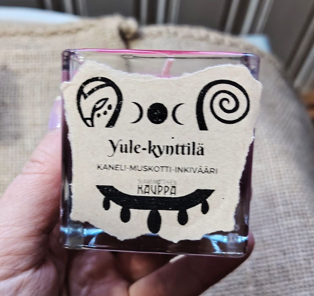 Ihana Yule-tuoksukynttilä, joka on tuoksutettu parabeenittomilla tuoksuöljyillä. Tässä on tuoksuna kaneli, muskotti ja inkivääri.Tuoksut ovat suht mietoja eli eivät liian voimakkaita.