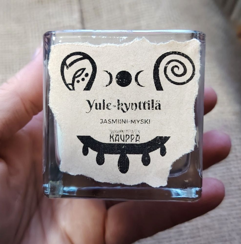 Ihana Yule-tuoksukynttilä, joka on tuoksutettu parabeenittomilla tuoksuöljyillä. Tässä on tuoksuna jasmiini-myski. Tuoksut ovat suht mietoja eli eivät liian voimakkaita.